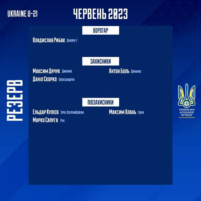 Резервний список: Владислав Рибак («Дніпро-1» Дніпро), Данило Скорко («Олександрія»), Антон Боль, Максим Дячук (обидва — «Динамо» Київ), Марко Сапуга («Рух» Львів), Максим Хлань («Зоря» Луганськ), Ельдар Кулієв («Зіра», Азербайджан).