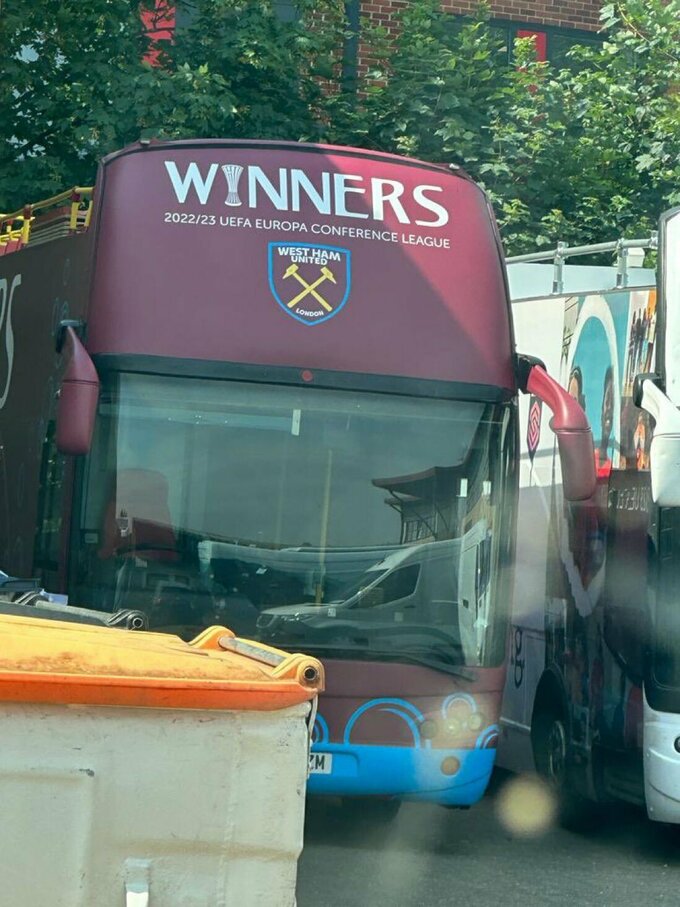 Спереду автобуса над лого молотобойців написано: «Переможці Ліги конференцій Європи УЄФА 2022/23».