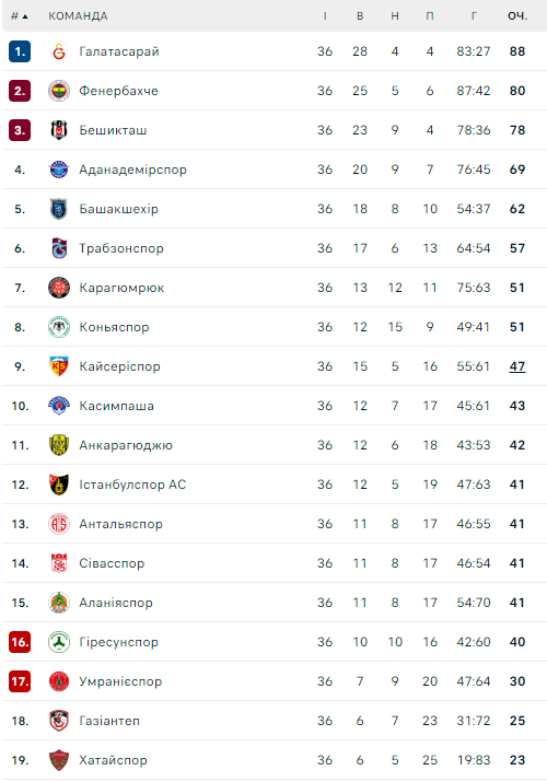 «Фенербахче» (80) випередив «Бешикташ» (78) у битві за друге місце, обидві команди зіграють у Лізі конференцій (почнуть з 2-го раунду).