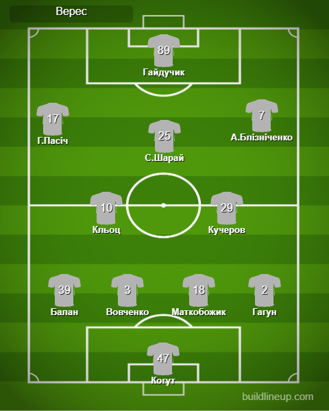 «Верес»: Когут, Балан, Маткобожик, Вовченко, Гагун, Кльоц (Лебеденко, 51), Кучеров, А.Блізніченко, С.Шарай (В.Шарай, 78), Г.Пасіч, Гайдучик (Шестаков, 64).