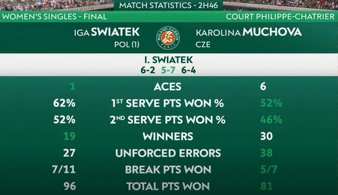 Свьонтек зіграла 30-й матч на кортах Ролан Гаррос, вигравши 28 із них.