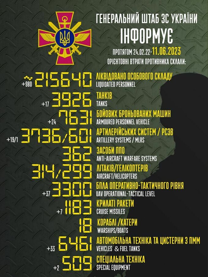 Пропонуємо до вашої уваги зведення загальних бойових втрат росії з 24.02.2022 по 11.06.2023.