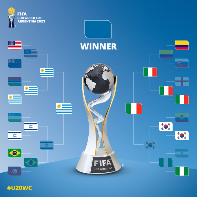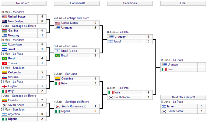 У півфіналах збірна Італії обіграла команду Південної Кореї (2:1), а Уругвай завдав поразки Ізраїлю (1:0).