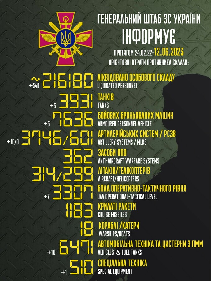 Пропонуємо вашій увазі зведення загальних бойових втрат росії з 24.02.2022 по 12.06.2023.