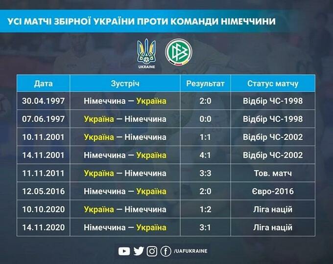 Загалом команди провели між собою 9 матчів. Україна поки не перемагала іменитого суперника - 5 перемог у Німеччини та 4 нічийні результати.