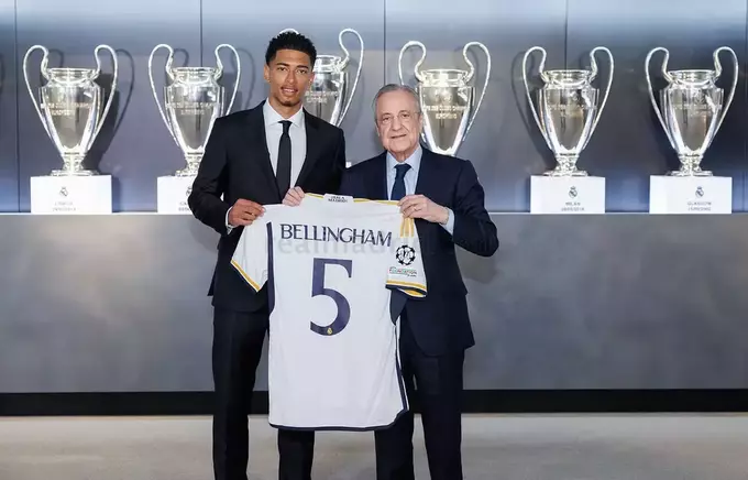Президент «Реала» Флорентіно Перес на церемонії представлення Беллінгема вручив йому ігрову футболку команди з 5-м номером.