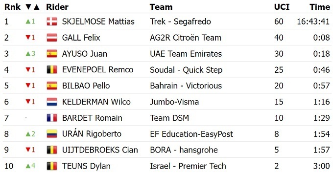 Ск'єлмосе перехопив у переможця вчорашнього етапу Фелікса Галля лідерство в загальному заліку, Аюсо піднявся на третє місце.