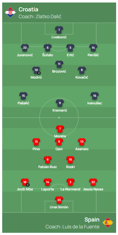Іспанія: Унаї Сімон, Жорді Альба, Ле Норман (Начо, 78), Ляпорт, Хесус Навас (Карвахаль, 97), Фабіан Руїс (Меріно, 78), Родрі, Піно (Фаті, 66), Гаві (Ольмо, 87), Асенсіо, Мората (Хоселу, 66).