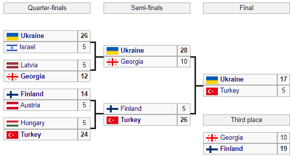 Жіноча збірна України у групі перемогла збірні Туреччини (22:12), Данії (22:0) та Молдови (43:0). У плей-оф синьо-жовта команда виграла ще три матчі: у чвертьфіналі в Ізраїлю (26:5), у півфіналі в Грузії (28:10) та у фіналі в Туреччини (17:5).