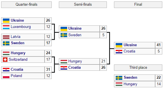 Чоловіча збірна України у груповому раунді обіграла збірні Польщі (33:17), Люксембургу (21:7) та Данії (29:10). Потім були три перемоги у плей-оф: у чвертьфіналі над Люксембургом (26:12), у півфіналі над Швецією (26:5) та у фіналі над Хорватією (41:5).