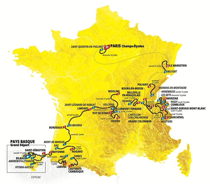 Старт у Країні Басків помітно вплине на конфігурацію нинішнього Туру, зробивши її досить незвичною. Наприклад, на першому тижні буде всього лише три спринтерських етапи – безпрецедентно мало як для «Великої петлі». У Піренеї гонщики заїдуть уже в середині першого тижня, в Альпах опиняться наприкінці другого та на початку третього. Кінцівка третього тижня буде незвично малонасиченою – жодного королівського гірського етапу чи розділки. Гонок на час на нинішньому Турі взагалі катастрофічно мало – одна-єдина на 16-му етапі, і та всього на 22 км. Кілометраж розділок найнижчий з 2015 року: на відміну від тієї ж Джиро, організатори «Великої петлі» не надто прагнуть зберігати баланс.