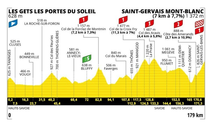 Завершувати етап буде подвійний підйом на Сен Жерве/Мон Блан. Перша його частина – короткий і дуже крутий підйом другої категорії Кот де Амерандс (2,7 км, 10,9%). Основна частина підйому на Сен Жерве теж важка – 7 км, 7,7%. Позаду – два поспіль важких гірських етапи, попереду – день відпочинку. Що ще потрібно для яскравої та відкритої битви в горах?