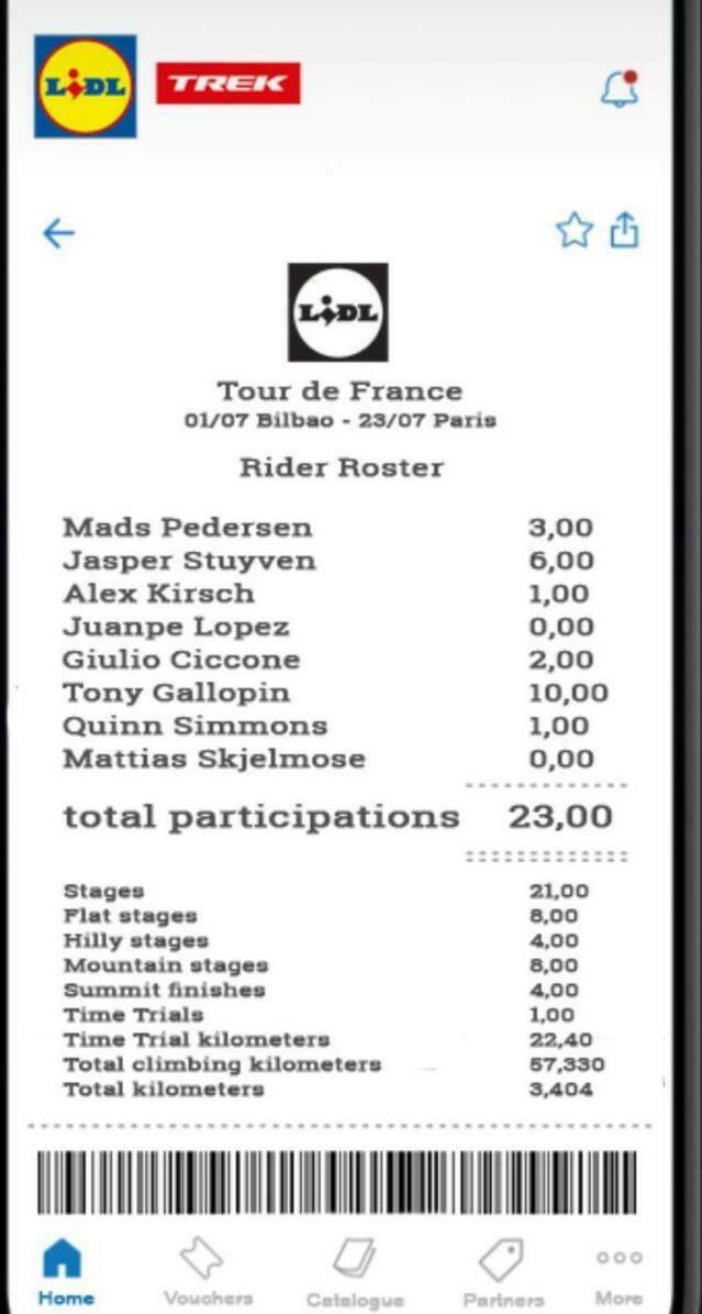 «Lidl Trek» порадували простою, і водночас геніальною ідеєю презентації складу команди на Тур: у вигляді касового чека з супермаркету «Lidl»: