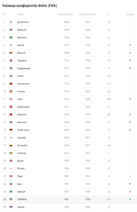 ФІФА опублікувала черговий рейтинг збірних. У ньому Україна піднялася на 24-те місце. У попередній версії «синьо-жовті» замикали тридцятку найкращих.