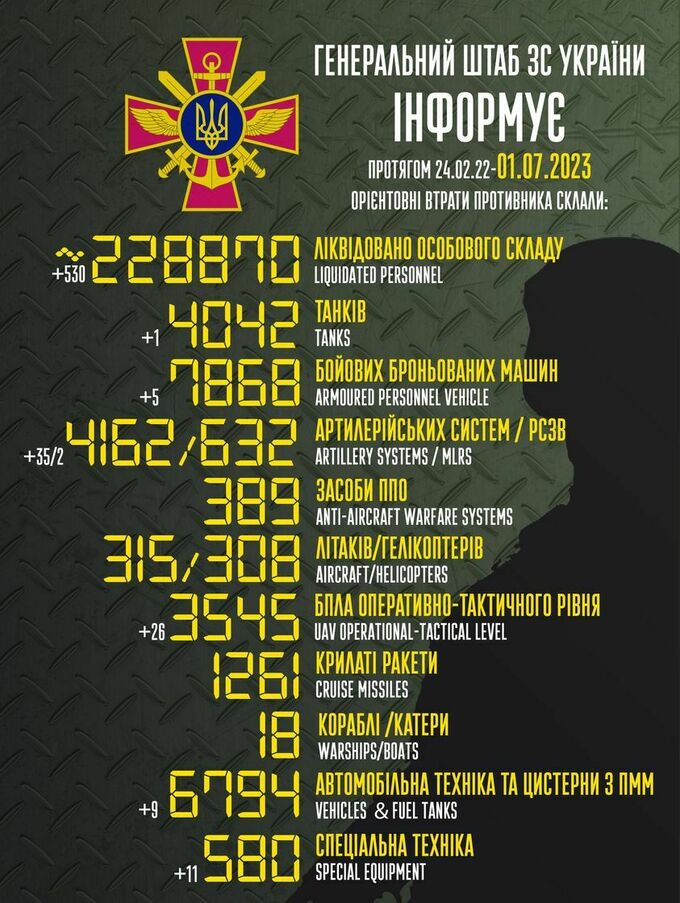 Пропонуємо вашій увазі зведення загальних бойових втрат росії з 24.02.2022 по 01.07.2023.