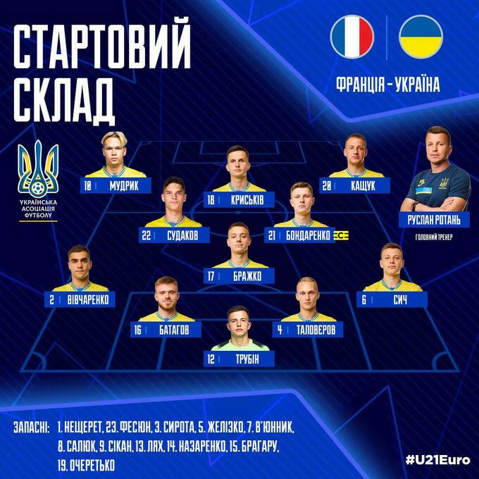 Україна U-21: Трубін – Вівчаренко, Таловєров, Батагов, Сич – Бондаренко (Желізко, 88), Бражко – Мудрик (Брагару, 78), Судаков, Кащук (Назаренко, 59) – Криськів (Сікан, 59).