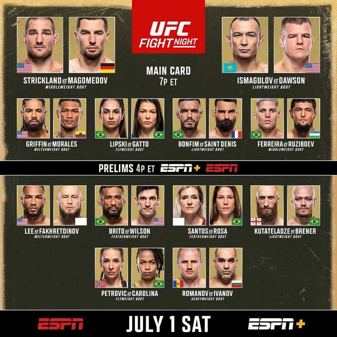 - Головний бій: Шон Стрікленд (США, 26–5) – абусуп'ян магомедов (без прапора / Німеччина, 25–4–1)