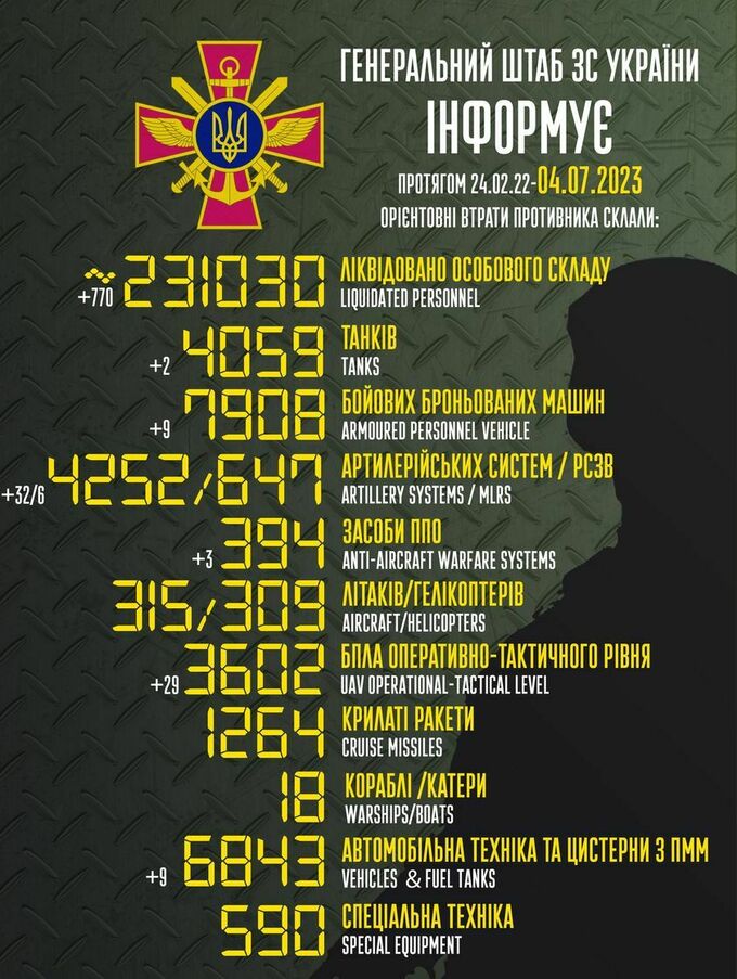 Пропонуємо вашій увазі зведення загальних бойових втрат росії з 24.02.2022 по 04.07.2023.