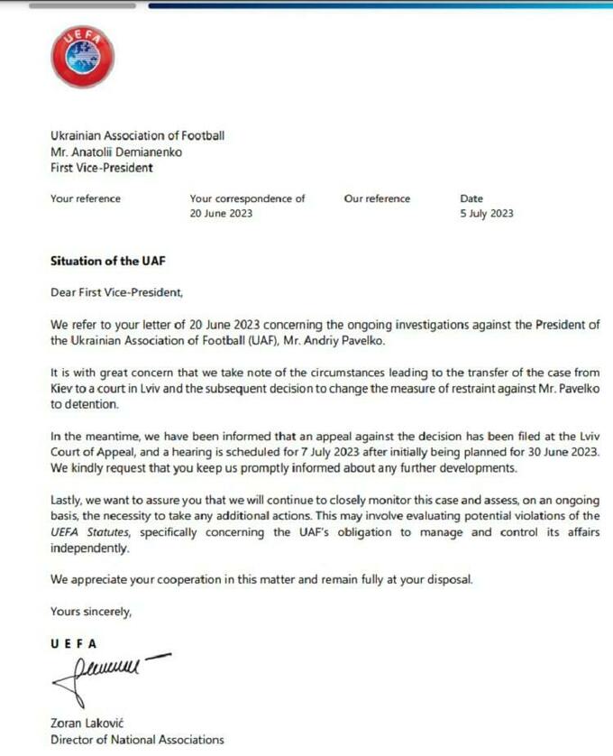 5 липня 2023 року на ім’я першого віце-президента Української асоціації футболу Анатолія Демяненка надійшов лист від директора національних асоціацій УЄФА Зорана Лаковича, в якому йдеться про ситуацію довкола УАФ та справи проти керівництва асоціації.
