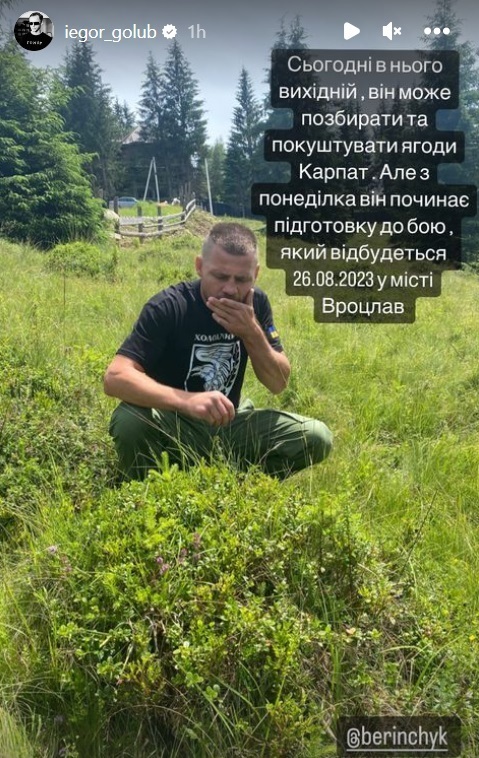 «Сьогодні у нього вихідний, він може позбирати і поїсти ягоди Карпат. Але з понеділка він починає підготовку до бою, який відбудеться 26.08.2023 у місті Вроцлав», – написав Голуб.