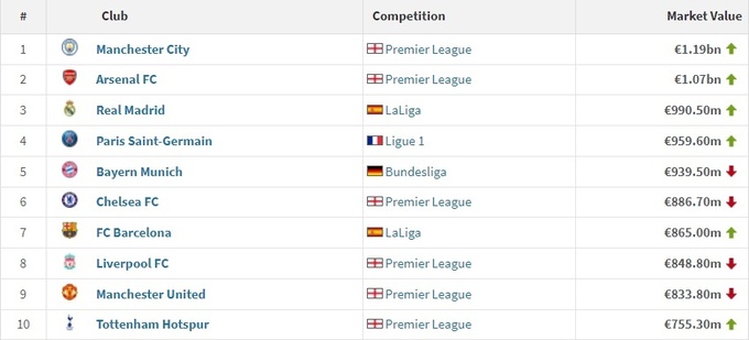 Повідомляється, що перше місце з показником у 1,19 млрд євро посідає «Манчестер Сіті».
