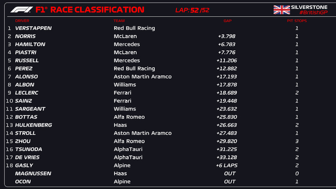 Відбулася гонка у рамках Гран-прі Великобританії. Перемогу здобув пілот Ред Булла Макс Ферстаппен, який стартував з поула. На старті його зумів випередити Ландо Норріс, але Ферстаппен швидко повернув собі лідерство і поїхав до перемоги.