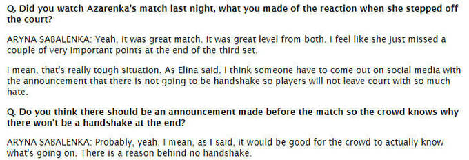 На відкритому спілкуванні зі ЗМІ Соболенко попросили прокоментувати реакцію вболівальників, які освистали Вікторію Азаренко після матчу Еліни Світоліної, коли українка відмовилася тиснути руку білорусці: