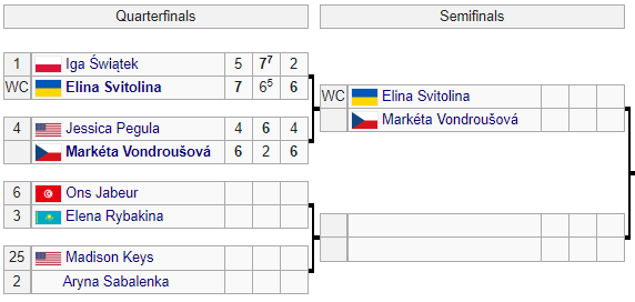 У 1/2 фіналу трав'яного мейджора Елі зіграє проти Маркети Вондроушової. Рахунок особистих зустрічей – 3:2 на користь української тенісистки. У 2021 році Еліна поступилася представниці Чехії в 1/2 фіналу Олімпійських ігор у Токіо.
