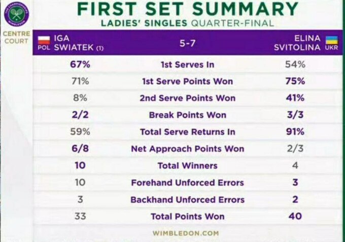 У першій партії Свьонтек 12 разів подала другим м'ячем і виграла лише 1 пойнт (8%)!