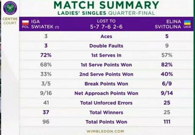 A five-star performance 🌟@ElinaSvitolina defeats the world No.1 Iga Swiatek 7-5, 6-7(5), 6-2 to reach the semi-finals at #Wimbledon once again pic.twitter.com/l6nUu17KHj