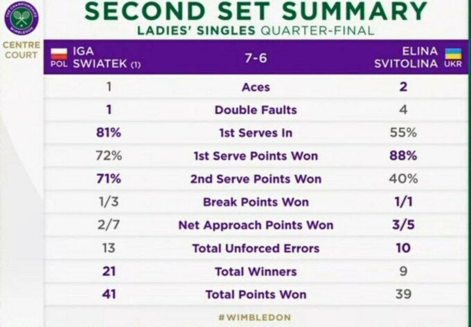 На тай-брейку Елі повела з міні-брейком 4:1, але на жаль… Свьонтек все-таки перший номер рейтингу WTA, з характером і бійцівським духом у неї все гаразд. Іга з 4:5 взяла 3 очки поспіль та виграла другий сет. Цікаво, що полька виграла 41 пойнт у 2-й партії, а Еліна – 39. Ці два очки...