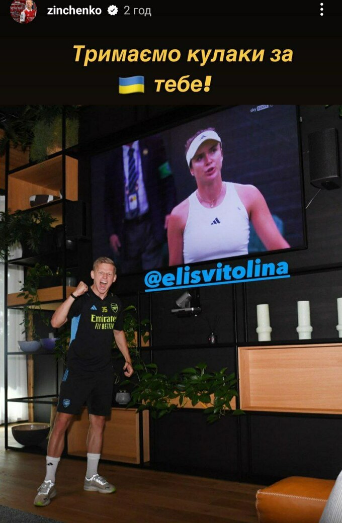 Український футболіст лондонського «Арсеналу» Олександр Зінченко привітав Еліну Світоліну (WTA 76) з перемогою над Ігою Свьонтек (Польща, WTA 1).