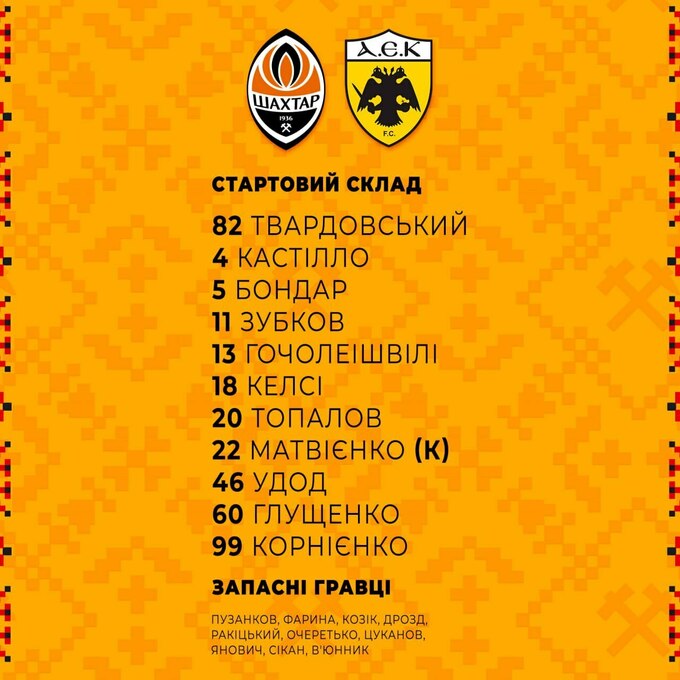 «Шахтар»: Твардовський, Гочолеішвілі, Бондар, Матвієнко, Корнієнко, Удод, Кастілло, Глущенко, Зубков, Топалов, Келсі.
