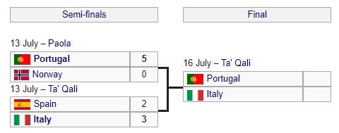 Португалія розгромила Норвегію (5:0), а Італія у важкому поєдинку здолала Іспанію (3:2). Переможний м'яч був забитий на 85-й хвилині.
