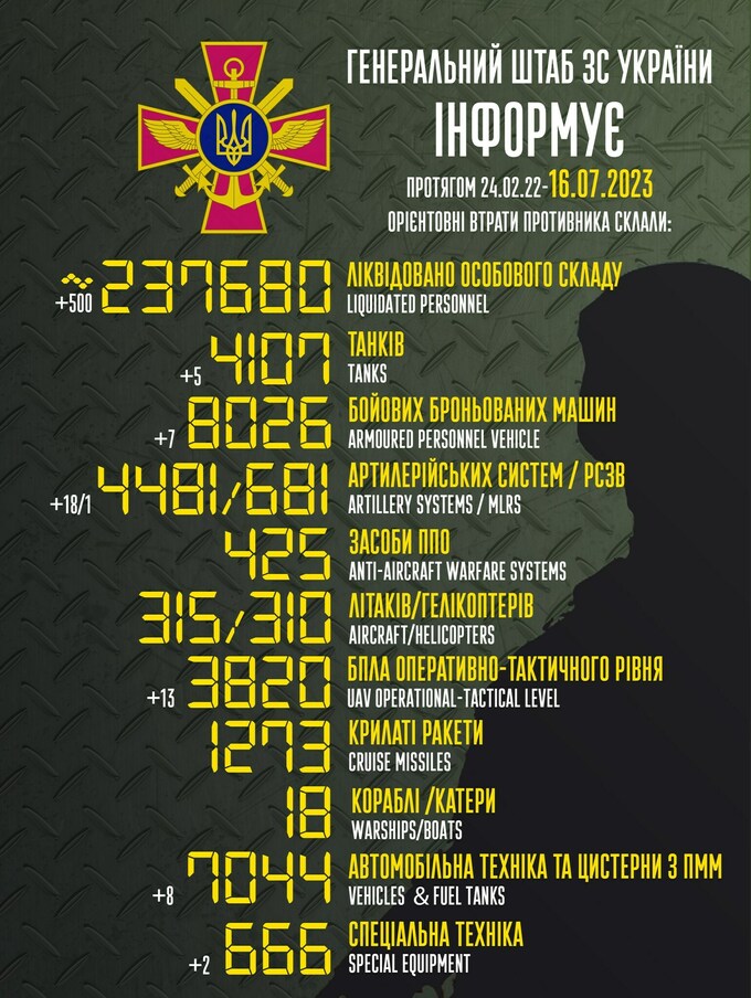 Пропонуємо вашій увазі зведення загальних бойових втрат росії з 24.02.2022 по 16.07.2023.