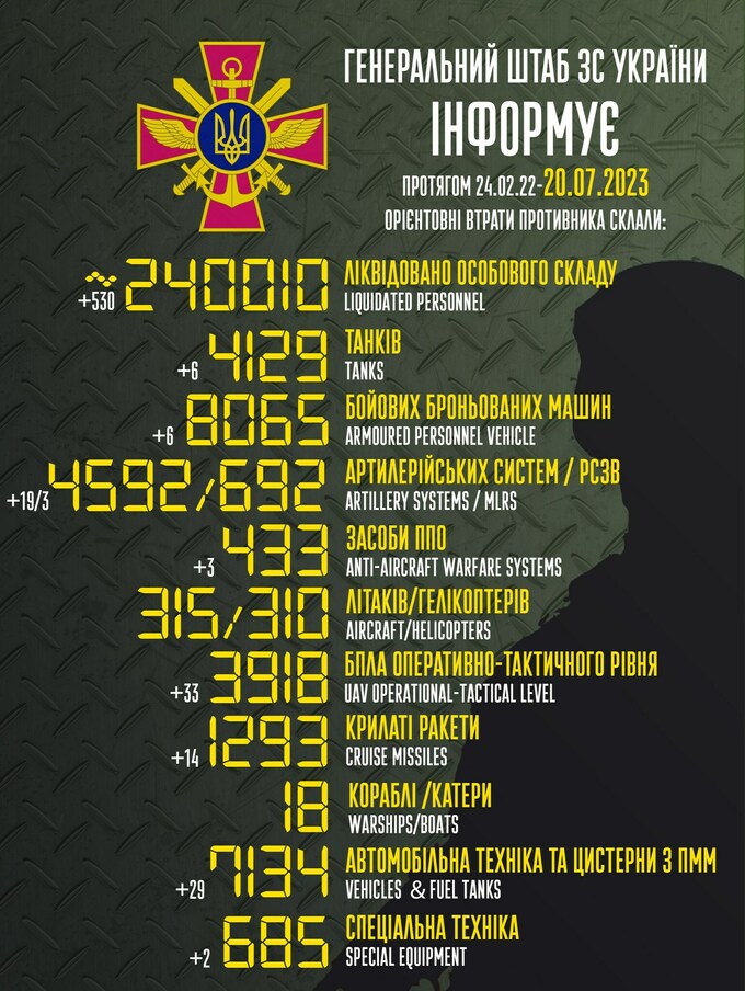 Пропонуємо вашій увазі зведення загальних бойових втрат росії з 24.02.2022 по 20.07.2023.