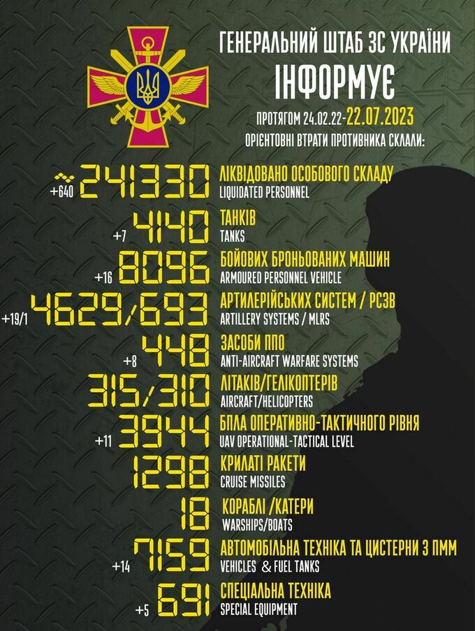 Пропонуємо вашій увазі зведення загальних бойових втрат росії з 24.02.2022 по 22.07.2023.