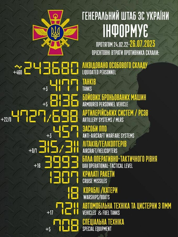 Пропонуємо вашій увазі зведення загальних бойових втрат росії з 24.02.2022 по 26.07.2023.