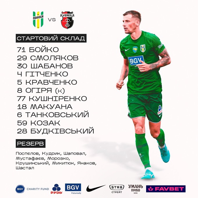 «Полісся»: Бойко – Смоляков, Гітченко, Кушніренко, Шабанов, Кравченко – Танковський (Крушинський, 84), Огіря – Макуана (Янаков, 73), Будківський, Козак (Шастал, 72).