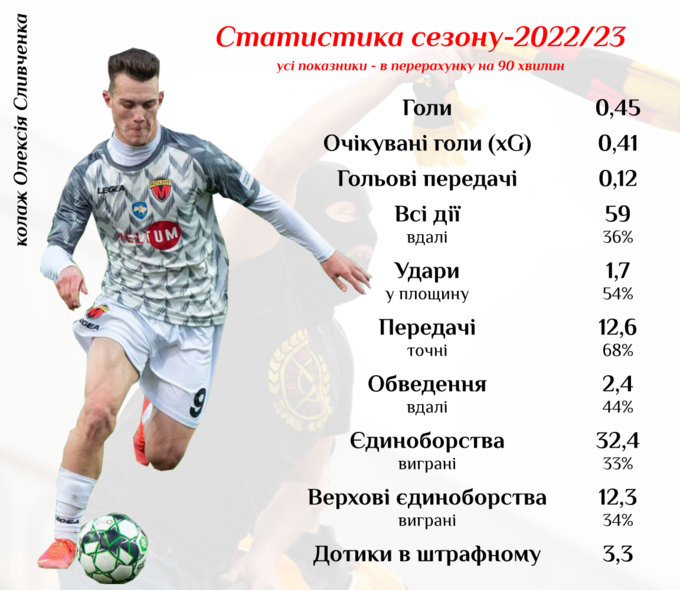 Також дуже цікаво подивитися на те, як Сидоров буде реалізовувати свої моменти вже на рівні УПЛ. Якщо у Першій лізі сезону-2022/23 в Олексія був середній (у перерахунку на 90 хвилин) показник очікуваних голів 0,41xG, а реально забитих м'ячів – 0,45, то у Прем'єр-лізі щось подібне вдається демонструвати вкрай небагатьом. При цьому, навіть у нижчій лізі Сидоров мав зовсім не вражаючий показник ударів – 1,7 в перерахунку на 90 хвилин, але при точності у 54%.