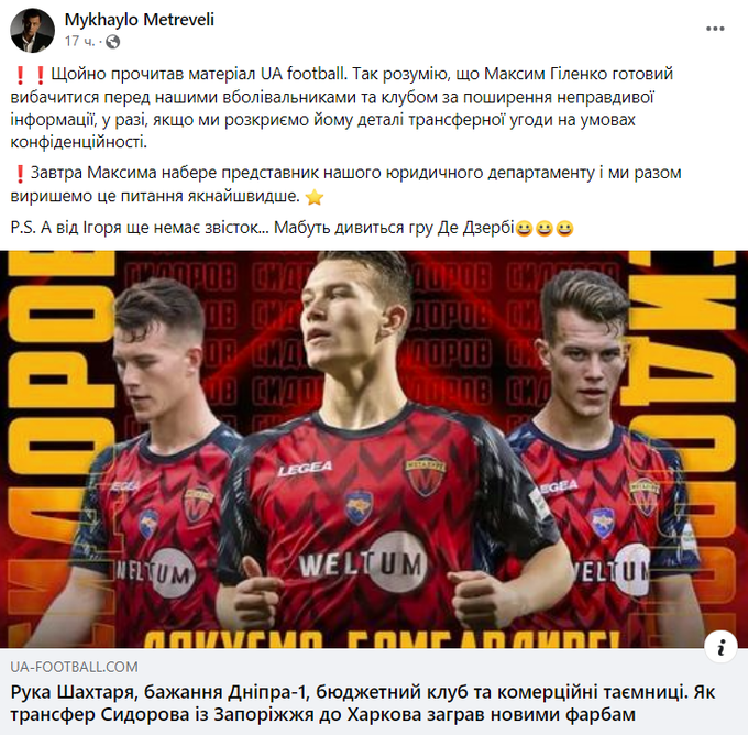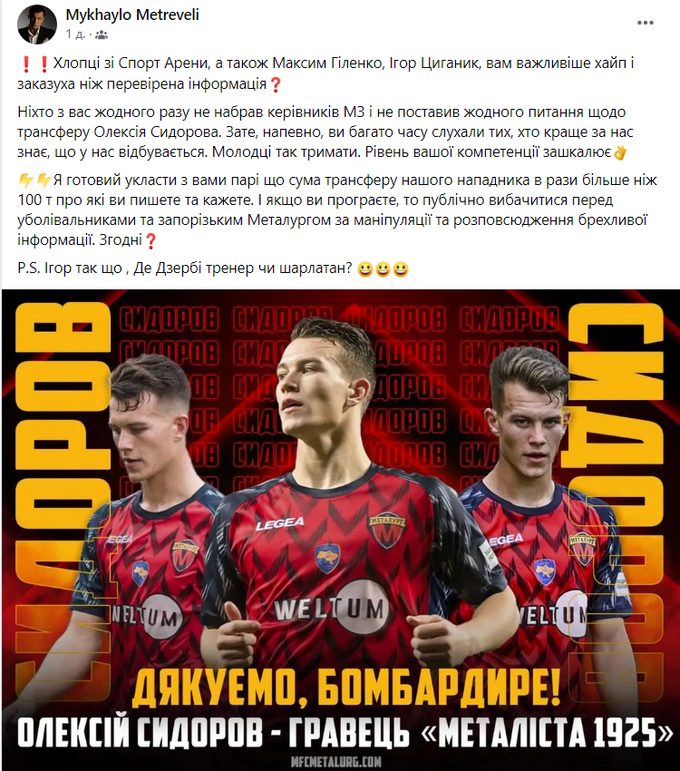 Примітно, що офіційно «Металург», схоже, таки не збирається оголошувати суму трансферу Сидорова до «Металіста 1925», через що пересуди навколо цієї угоди все одно залишаться, які б парі не пропонував та, можливо, навіть не вигравав у своїх опонентів Метревелі. Єдиною чіткою іміджевою перемогою у цьому питанні над усіма, про кого згадував спортивний директор «Металурга», може бути лише офіційна заява від імені клубу або когось із його топ-менеджерів із розкриттям усієї повноти запитуваних даних.