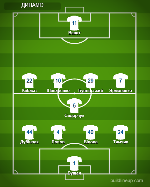 «Динамо»: Бущан - Тимчик, Біловар, Попов, Дубінчак - Сидорчук (Бражко, 83) - Ярмоленко (Караваєв, 76), Шапаренко (Шепелєв, 83), Буяльський, Кабаєв (Сирота, 34) - Ванат (Беніто, 76).