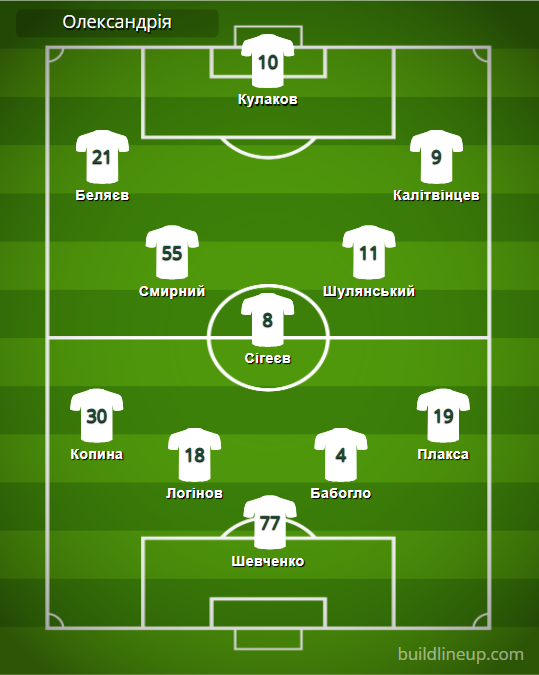 «Олександрія»: Шевченко – Копина, Логінов, Бабогло, Плакса (Калюжний, 68) – Смирний (Савченко, 57), Сігеєв, Шулянський (Скорко, 81) – Беляєв (Авагімян, 58), Кулаков (Андрейчук, 67), Калітвінцев.
