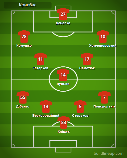 «Кривбас»: Кліщук – Дібанго, Бескоровайний, Стецьков, Понєдєльнік – Татарков (Бізімана, 46), Луньов (Устименко, 79), Семотюк – Кожушко (Блізніченко, 78), Дебелко (Іліч, 46), Хомченовський (Задерака, 85).