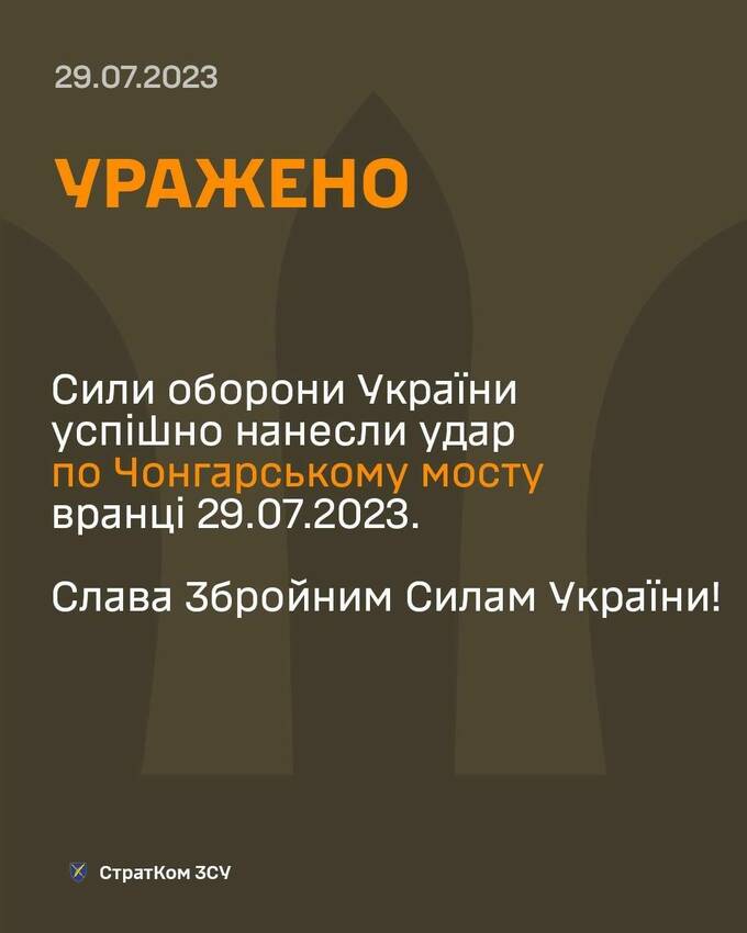 Як повідомило Стратегічне командування Збройних сил України на своїх сторінках у соцмережах, вчора, 29 липня, було нанесено успішний удар по Чонгарському мосту.