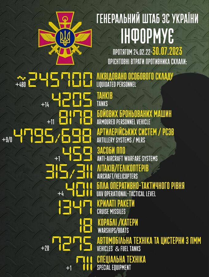 Пропонуємо до вашої уваги зведення загальних бойових втрат росії з 24.02.2022 по 30.07.2023.