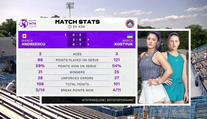 Б'янка Андреєску (Канада) – Марта Костюк (Україна) – 6:2, 3:6, 6:7 (5:7)