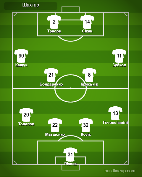 «Шахтар»: Різник, Матвієнко, Козік, Гочолеішвілі (Фарина, 46), Топалов, Бондаренко, Криськів (Кастілло, 84), Зубков (Очеретько, 46), Кащук (В'юнник, 58), Сікан, Траоре (Педріньйо, 84).