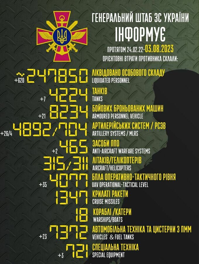 Пропонуємо вашій увазі зведення загальних бойових втрат росії з 24.02.2022 по 03.08.2023.