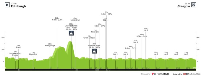 Якщо говорити про маршрут групової гонки, то загалом, незважаючи на дистанцію в 272 км, він не дуже складний за рельєфом (набір висоти – 2900 метрів) і дає шанси на перемогу максимально широкому колу гонщиків. Серед п'яти Монументів за своїм характером гонка найбільше нагадує Мілан – Сан Ремо. З тією різницею, що в Глазго підйоми будуть помітно простішими, але їх буде набагато більше.